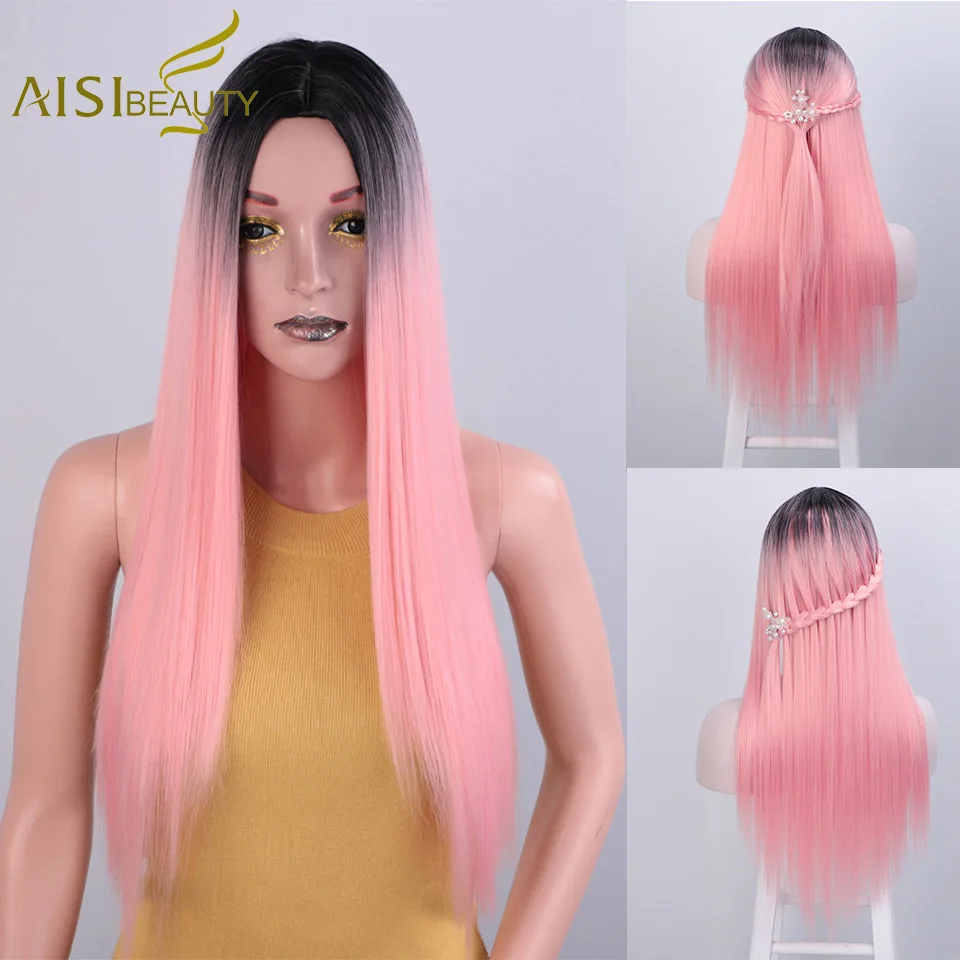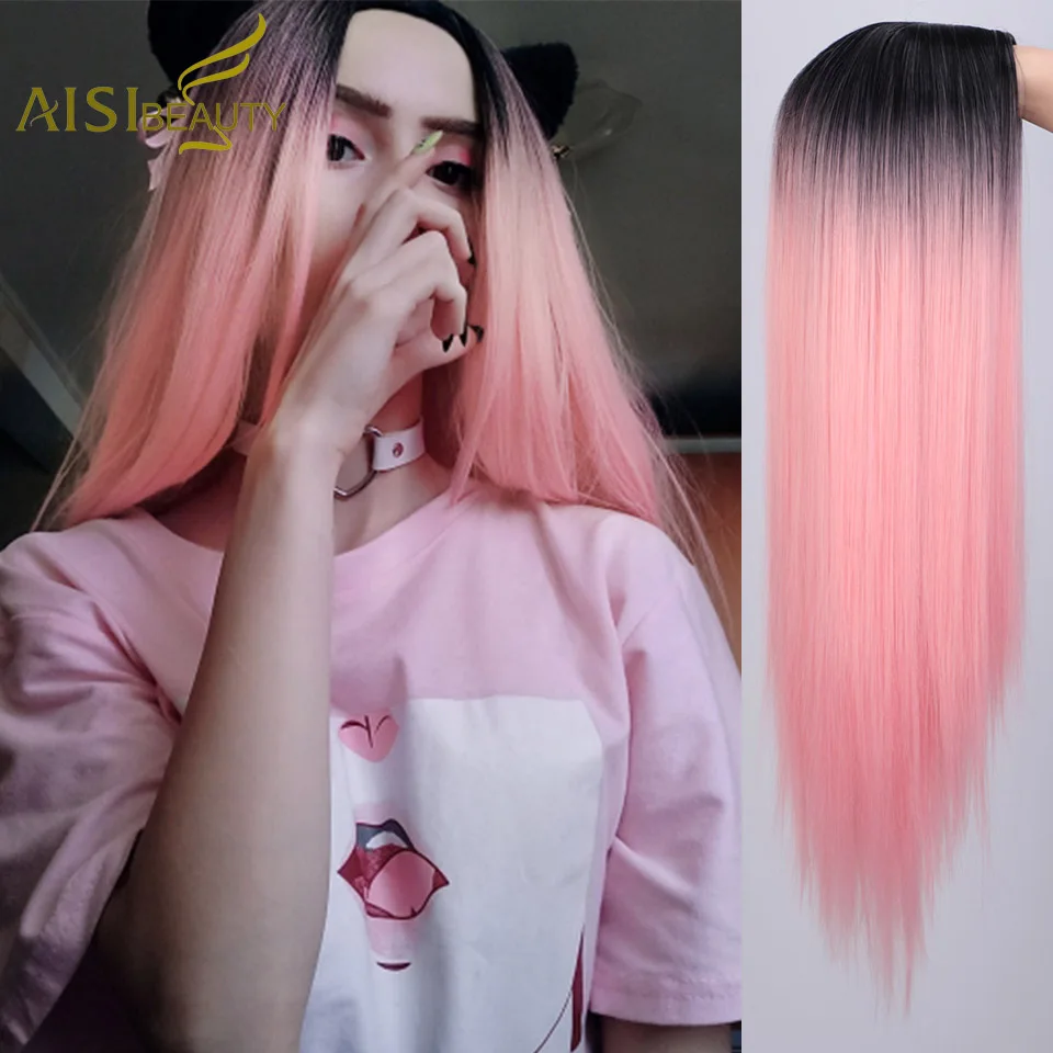 AISI BEAUTY Long Ombre Pink Wig Synthetic Wigs for Black/White Women Straight Red Blonde Green Grey