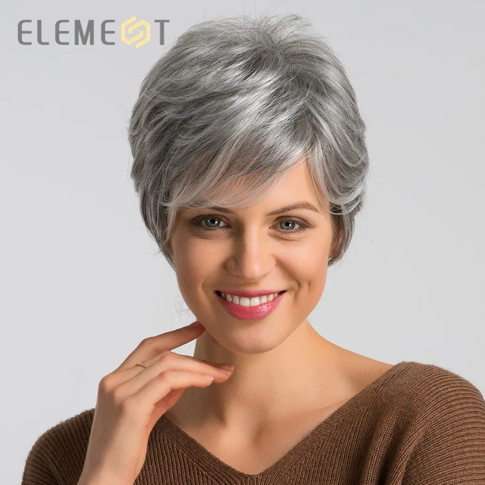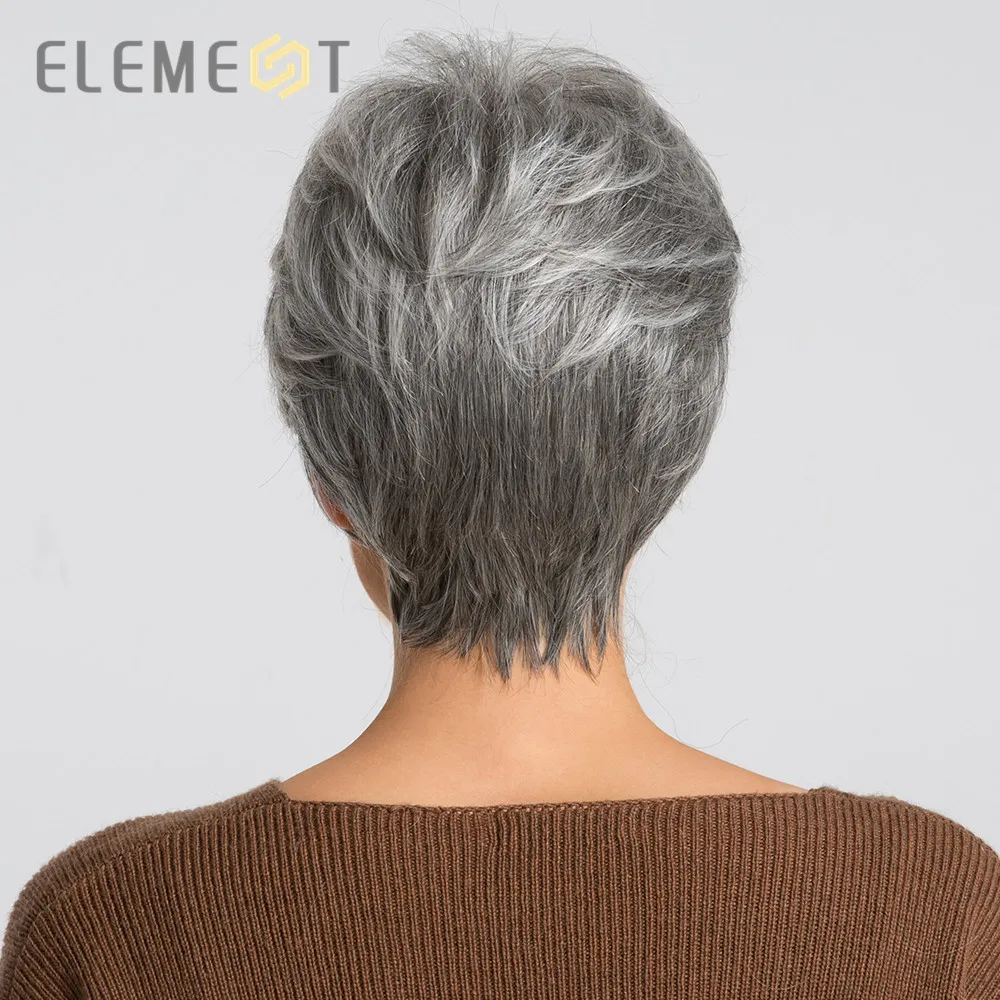 Element 6 inch Synthetic Gray Short Hair Wig Blend 50% Human Hair Left Side Parting Pixie Cut Wigs